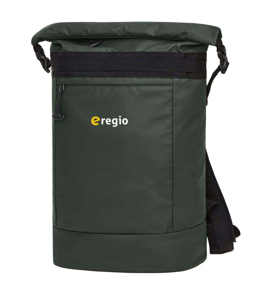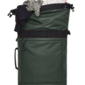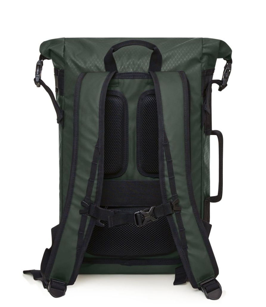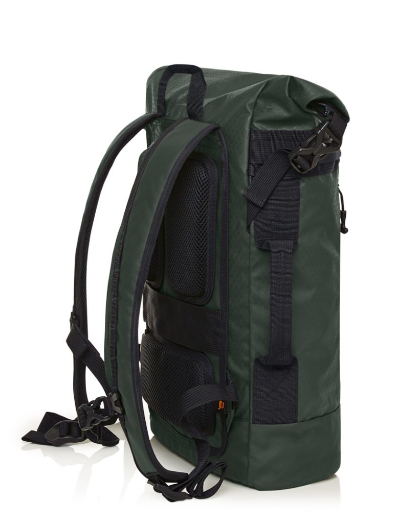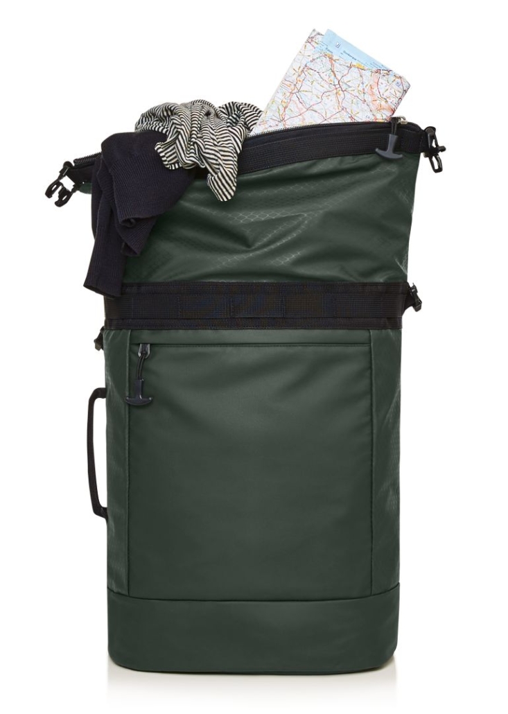 Aufwändig gearbeiteter Rolltop-Rucksack mit großem Reißverschluss-Hauptfach und seitlichen Steckverschlüssen.